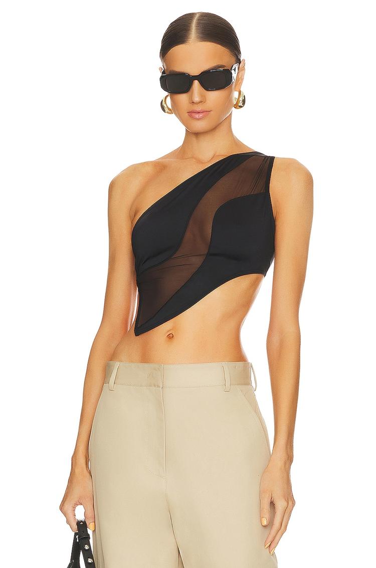 Sleek and daring, this cropped curve top features a matte black polyester-spandex blend with sheer mesh panels that create an alluring asymmetric neckline and strapless sleeve styling. The slim fit and tie-back closure enhance its modern, edgy appeal, perfect for summer nights out, intimate date nights, or vibrant party scenes. The sheer panels add a unique texture contrast, making this piece a standout choice for confident and stylish looks.