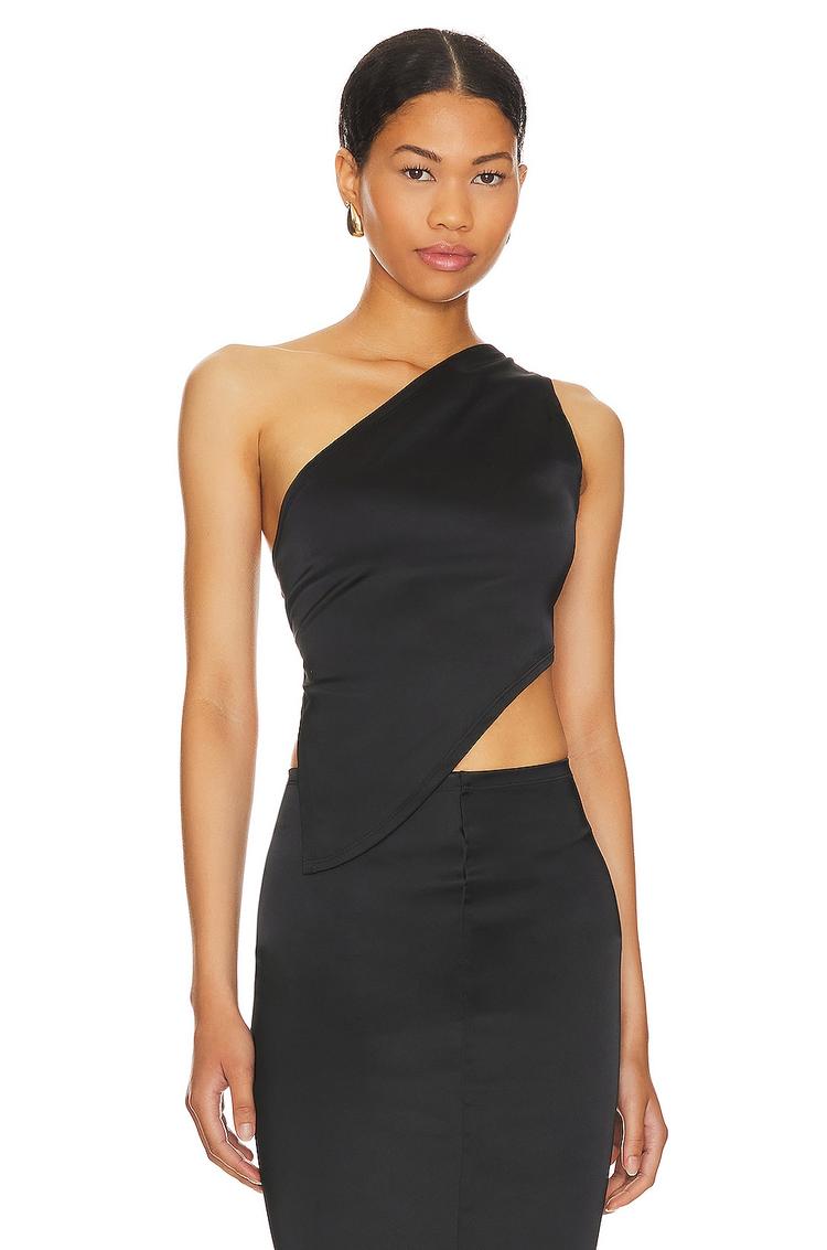 Embrace a sleek, modern silhouette with the Jamie Top by Ow Collection. This black, one-shoulder top features a lightweight sateen polyester blend, a dramatic asymmetrical hem, and a wrapped bodice that skims the waist for a flattering, cropped fit. A back tie closure lets you tailor the silhouette to your body, while the single-shoulder line adds refined drama. Dress it up with a high-waisted skirt or a tailored pant for cocktail nights or date nights, or keep it minimalist for a chic day-to-evening look. Effortless, versatile, and undeniably elegant.