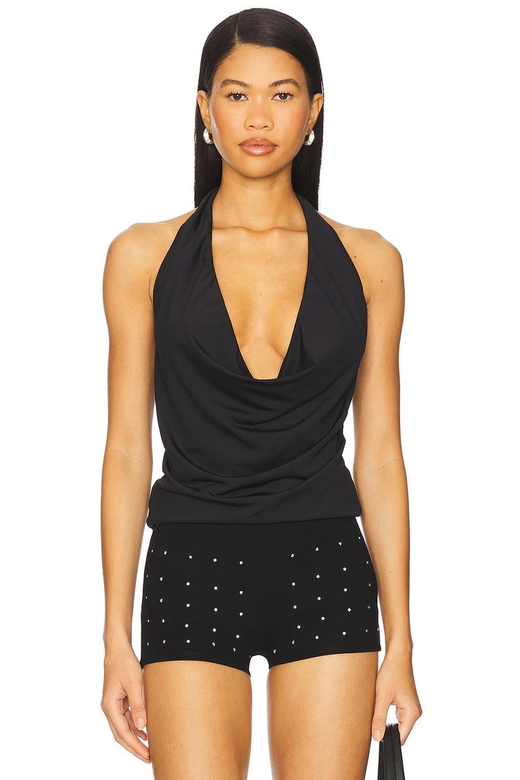 A plunging cowl neckline and halter self-tie closure define this sleek matte black tank top, crafted from a stretchy polyester-elastane jersey fabric. Its fitted silhouette and sleeveless design with tie-back detail create a chic and sexy look, perfect for night outs, date nights, and girls' nights. The hip-length cut enhances versatility, allowing effortless pairing with various bottoms for a modern, stylish vibe.