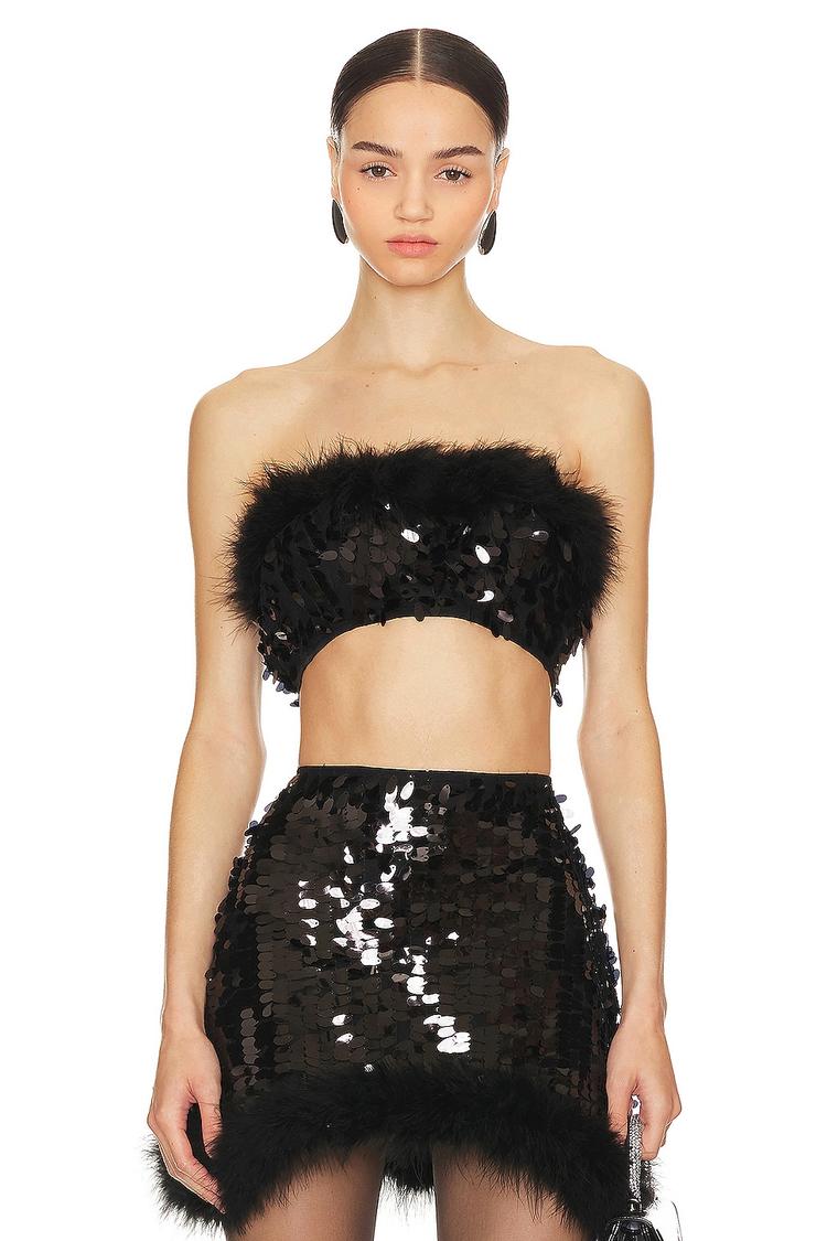 Dazzle the night away in this fitted bandeau top featuring a cropped length and strapless neckline for a bold, glamorous look. Crafted from midweight sequin-embellished polyester with a nylon-elastane lining, it offers both sparkle and comfort. The dyed turkey feather trim adds an edgy, chic border detail that elevates your party or cocktail outfit. Ideal for night outs, cocktail events, and lively parties, this sleek black top pairs perfectly with high-waisted skirts or trousers for an unforgettable style statement.