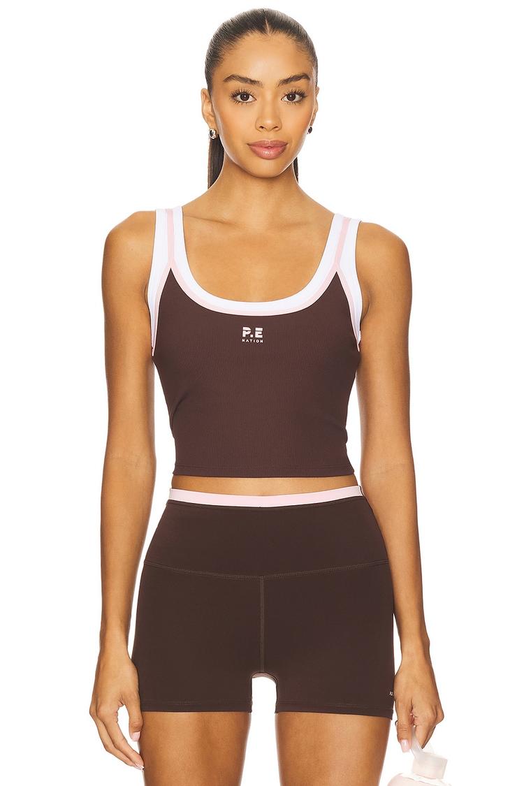 A sleek and fitted tank with wide straps and a scoop neckline, crafted from stretchy nylon-elastane blend for performance and comfort. The cropped length and contrasting light pink trim add sporty appeal, making it ideal for workouts, athleisure, or casual spring and summer days. Its pullover style with an attached shelf bra offers ease and support in one versatile piece.