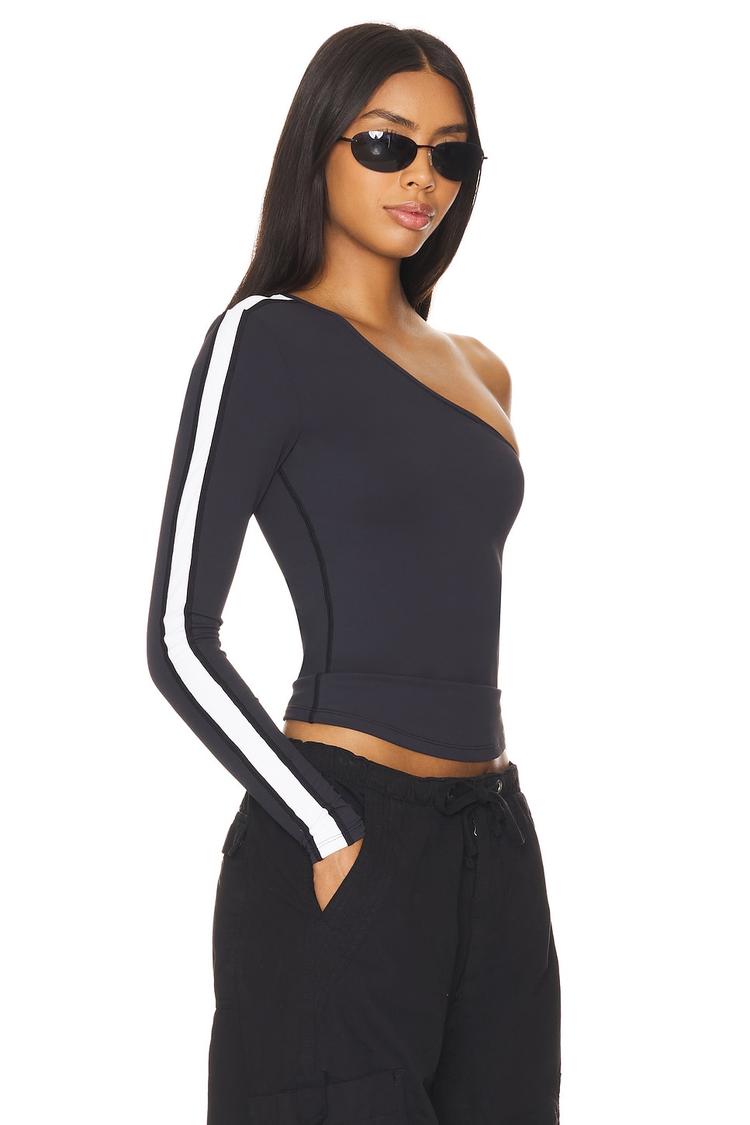 Effortless and bold, this Foundation asymmetric long sleeve top channels street-ready sophistication. In a deep black jersey knit, the cropped pull-on silhouette hugs the body while the one-shoulder neckline delivers an impactful, sculptural look. The left arm features a long sleeve with a crisp white stripe running down the length for a sporty edge. Made from a polyester blend jersey, it’s stretchy, soft, and easy to wear. Pair with high-rise joggers or tailored shorts for casual days, or dress up with sleek pants for a night out. A versatile, modern top with edgy charm.