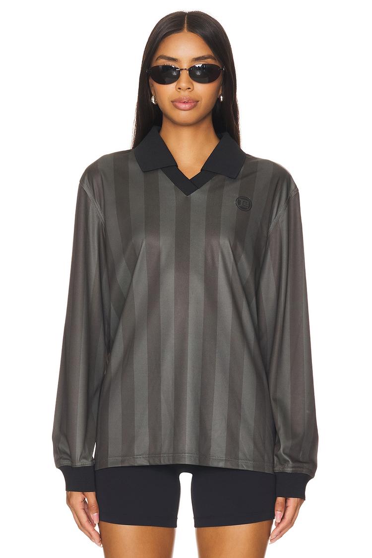 Subtle tonal stripes and a sleek satin jersey collar define this Athletic long sleeve top, designed for a loose, comfortable fit. Crafted in 100% polyester, it offers breathable wear with a pullover style and hip length hem that suits casual, athleisure, and streetwear looks alike. The matte black base contrasted by dark gray stripes lends a modern sporty chic vibe, making it ideal for workouts, travel, or relaxed weekends. Its V-neckline and regular sleeves add versatile appeal to this stylish and functional piece.