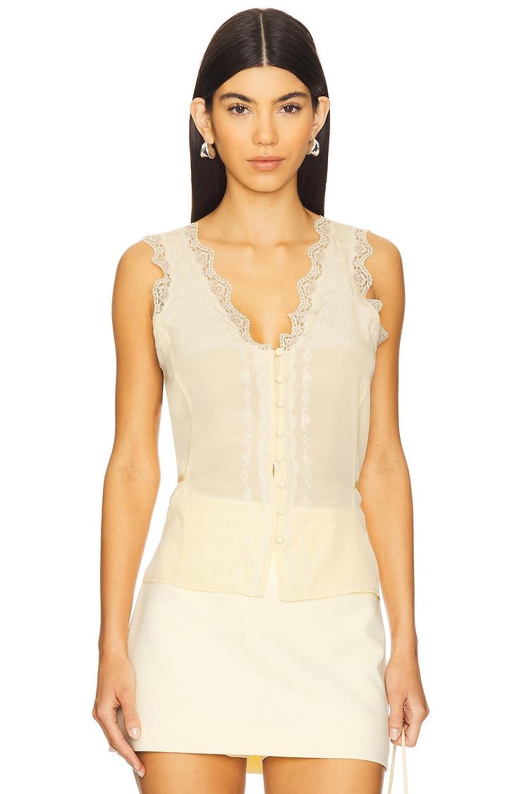 Delicate tonal embroidery and lace trim enhance the fitted corset silhouette of this waist-length top crafted from lightweight satin silk blend. Featuring a flattering V-neck and sleeveless strapless styling, the front loop button closure and back tie-up add refined detail and adjustability. This elegant and romantic piece suits warm spring and summer days and transitions effortlessly for casual brunches, date nights, or evening outings. Its soft cream hue and luxurious fabric offer a chic, sophisticated vibe perfect for elevating your wardrobe staples.