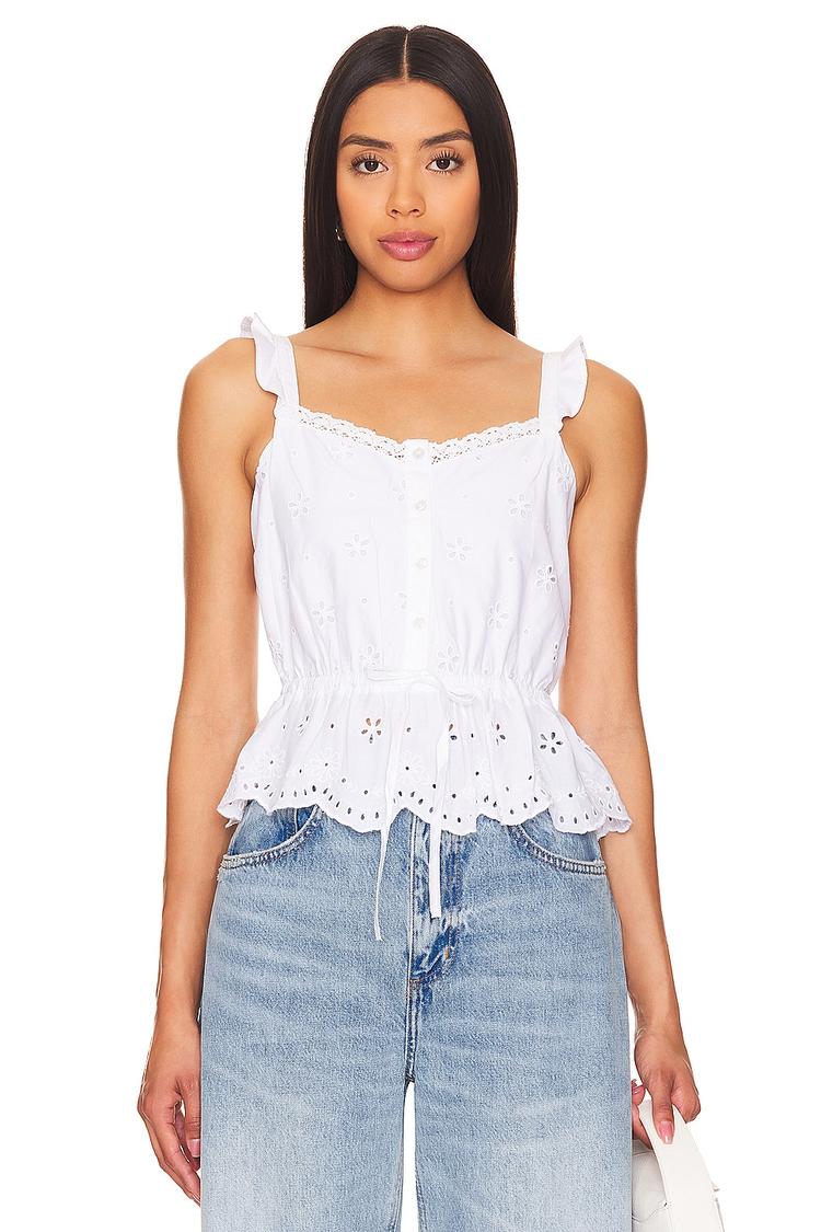 Lightweight cotton eyelet fabric and delicate ruffled hems lend this shell top a romantic charm, perfect for warm spring and summer days. The waist-length silhouette with a drawstring detail enhances a regular fit, while flutter sleeves and a square neckline add airy femininity. Front button closure complements the casual chic vibe, making this top suitable for casual outings, brunch dates, or everyday wear. Crafted with breathable cotton, it’s an effortlessly stylish choice for a relaxed yet refined look.