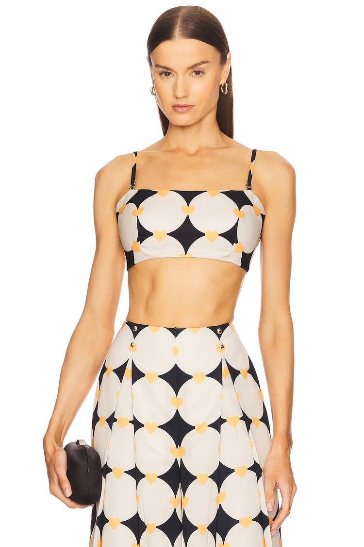 Bold geometric patterns in matte black, off-white, and yellow adorn this fitted cropped top crafted from midweight twill fabric. Featuring a modern square neckline and delicate spaghetti straps, it offers a chic silhouette perfect for warm weather. The back is neatly finished with a covered style and a hook and eye closure for secure wear. Versatile for casual outings, brunch dates, and night outs, this trendy top brings a contemporary edge to your seasonal wardrobe.