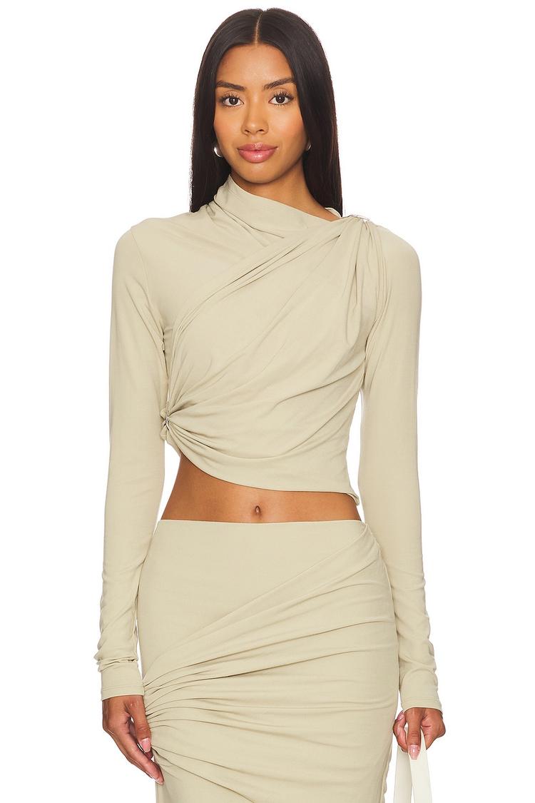 A soft beige dream in modal with a touch of spandex, this Aria Top from Paris Georgia exudes effortless sophistication. The long-sleeve crop is kissed with a twisted, draped front that forms a chic wrap neckline, then opens at the back for a hint of allure. Crafted from 91% modal and 9% spandex, it feels luxuriously soft yet moves with you, delivering a flattering, fitted silhouette. Pair with high-waisted trousers or a sleek skirt for day-to-night versatility. Clean lines, refined drape, and a modern, minimal vibe make this piece instantly elevating.
