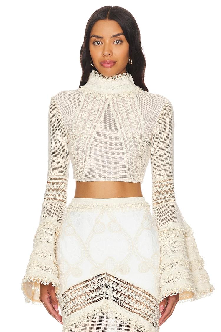 Delicate sheer panels and a fitted silhouette define this cropped top with a chic mock neck and dramatic bell sleeves accented by fringe detailing. Crafted from a luxurious blend of polyester, elastane, polyamide, and cotton, it offers both comfort and style. The exposed back zipper adds a modern touch to this elegant, bohemian-inspired piece. Ideal for spring to autumn wear, it effortlessly transitions from casual brunches to intimate date nights or lively evenings out, making it a versatile addition to your wardrobe.