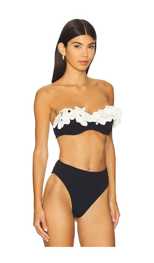 PATBO BREEZE JACQUARD FLOWER APPLIQUE BIKINI TOP IN BLACK.