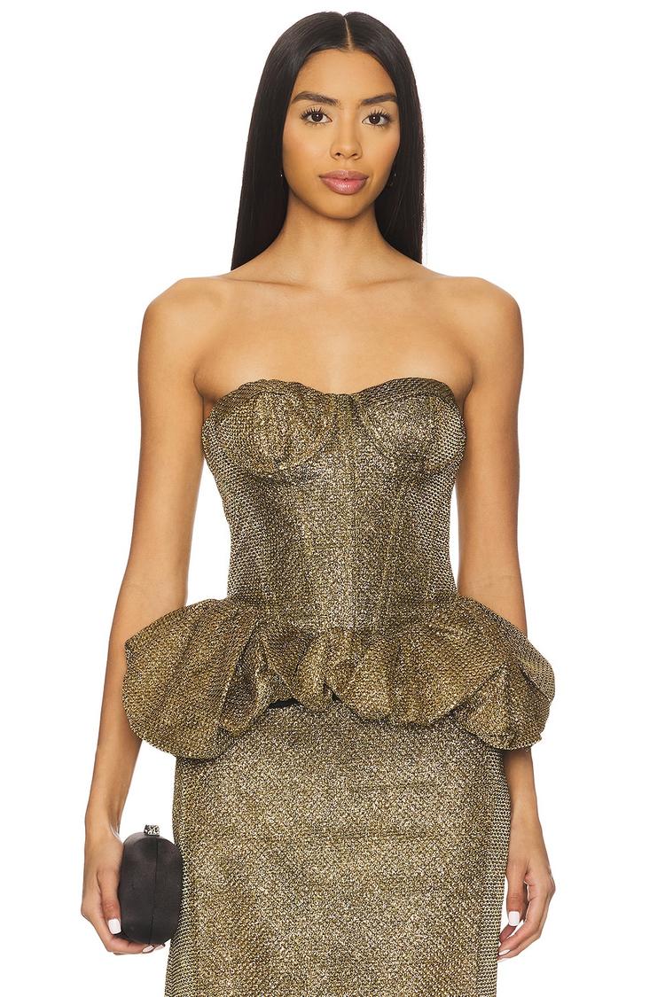 Metallic gold shimmer and structured boning define this fitted corset peplum top, offering a striking silhouette with a straight, strapless neckline and a cropped length. The ruffled hem adds a playful yet elegant touch, while the back zipper closure ensures a sleek fit. Crafted from midweight metallic polyester and polyamide blend fabric, it’s perfect for night outs, cocktail events, and semi-formal occasions where sophistication meets glamour.