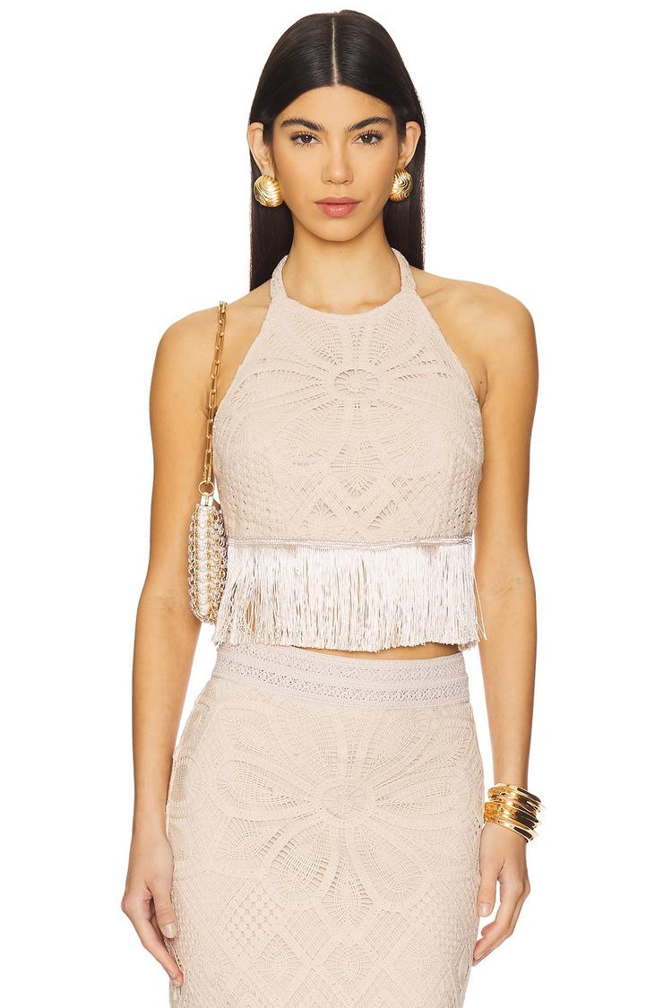A sun-kissed, bohemian-chic cropped halter top in beige cotton crochet, perfect for warm-day romance and night-out adventures. The halterneck ties with a delicate button loop, while a discreet back zipper ensures a smooth silhouette. A midweight crochet fabric frames floral motifs and a playful fringe hem moves with every step, making it ideal paired with high-waisted skirts or denim for a festival, date night, or cocktail-hour look. Lined with polyamide-elastane for subtle stretch, this versatile piece blends romantic texture with modern fit for effortless styling from day to night.