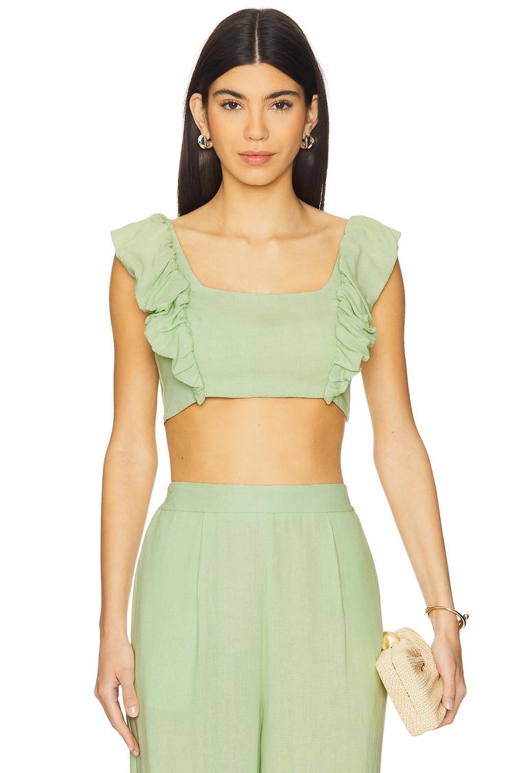 Soft ruffles frame the sleeveless cropped silhouette of this fitted Jocelyn Crop Top, crafted from a comfortable polyester-elastane blend with a matte light green finish. The square neckline and tie-back closure add charming details, while the midweight fabric ensures easy wear during spring and summer. Perfect for casual days, brunch dates, or vacation getaways, this top elevates your warm-weather wardrobe with its cute and casual chic style.