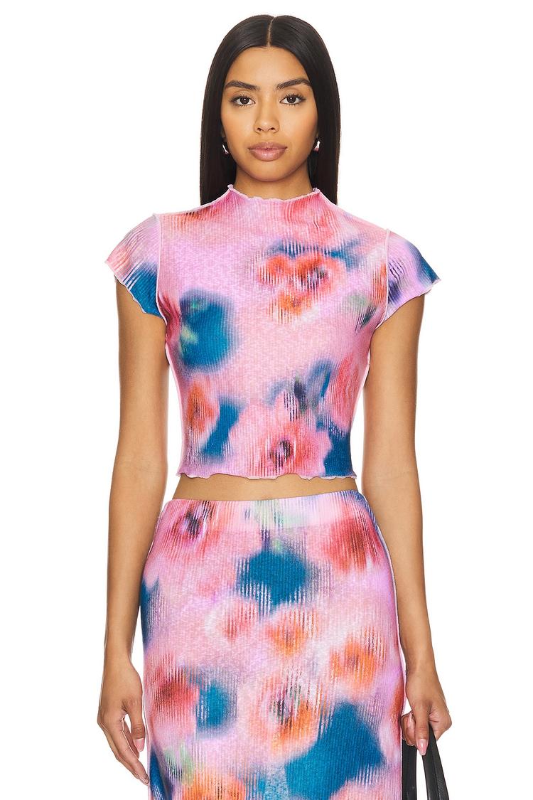 Lightweight polyester fabric and a fitted silhouette define this cropped top with a high neckline and cap sleeves. The abstract all-over pattern in shimmering light pink, blue, and coral hues creates a fresh and trendy look, while the delicate lettuce trim at the hem adds a subtle ruffled detail. Ideal for spring and summer, this modern piece is perfect for casual outings, brunch dates, or vacation wear, combining style with easy-to-wear comfort.