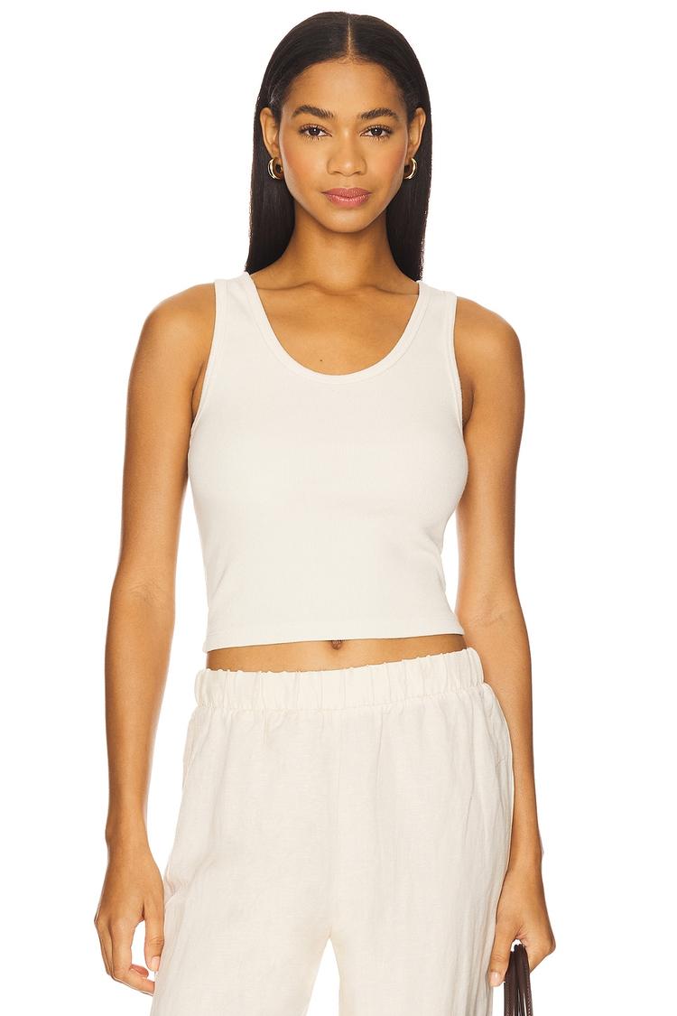 Midweight ribbed jersey fabric shapes this fitted cropped tank in a soft matte off-white hue. Featuring wide straps and a classic round neckline, it offers a minimalist silhouette ideal for layering or wearing alone. The sleeveless design and breathable cotton-spandex blend ensure comfort and ease, perfect for casual outings, everyday wear, or relaxed travel days. This versatile piece pairs effortlessly with high-waisted bottoms for a chic, casual-chic look in spring, summer, and autumn.
