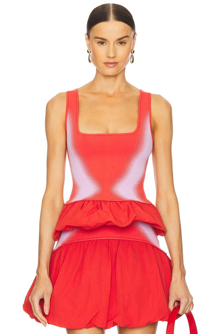 Bright red ponte fabric and a fitted silhouette define this sleeveless tank top with a flattering square neckline and wide straps. The standout bubble hem ruffle detail at the waist adds playful volume and texture to the waist-length design. Crafted from a midweight polyester-cotton blend, it balances comfort and structure effortlessly. This modern, casual chic tank is ideal for spring and summer outings, from casual brunches to everyday wear, offering a vibrant pop of color and stylish detail to your warm-weather wardrobe.