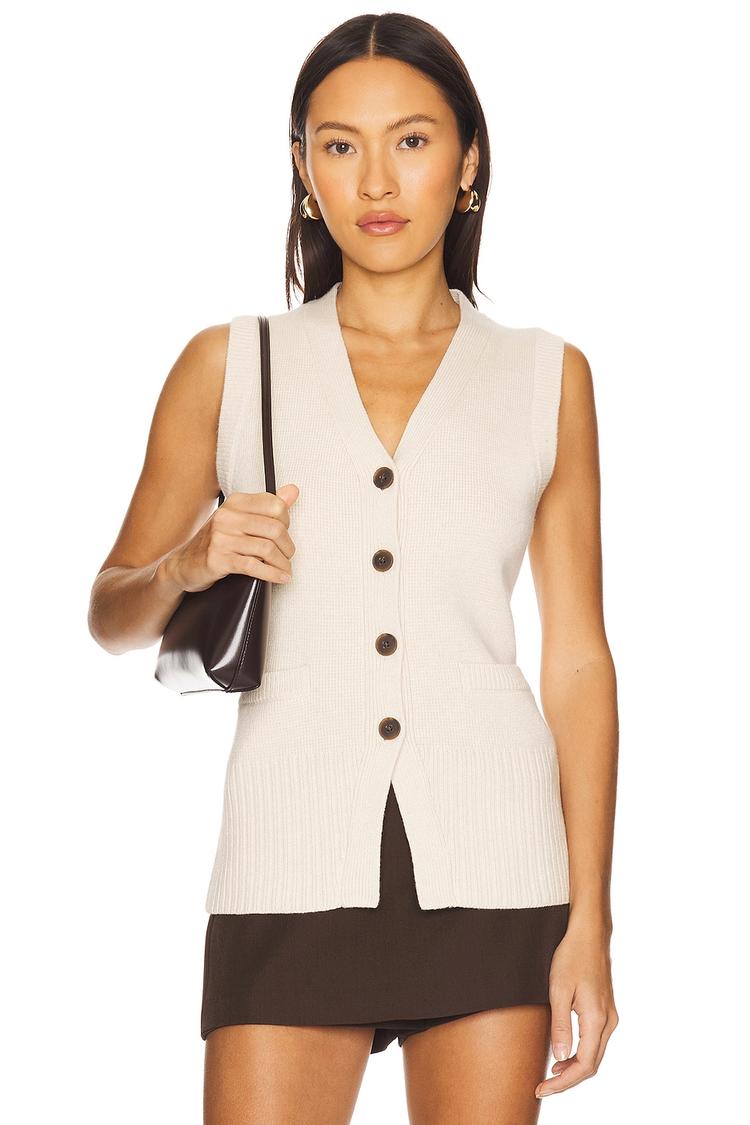 Soft ribbed knit fabric in a creamy hue shapes this fitted tank top featuring a flattering V-neckline and sleeveless styling for easy layering. The front button closure and practical pockets add subtle functional charm, making it an elegant choice for casual outings, workwear, or brunch gatherings during transitional seasons. Its classic minimalist design and midweight blend of cotton, wool, nylon, and cashmere bring timeless comfort and sophistication to any wardrobe.