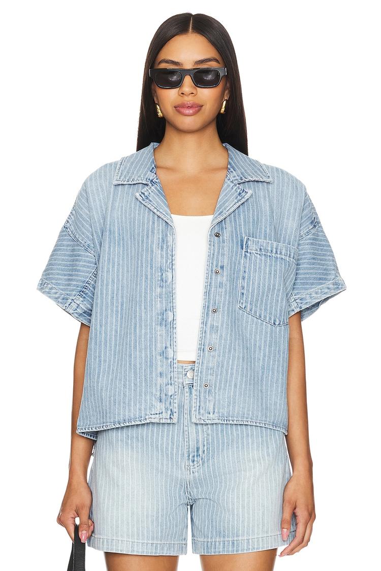 Relaxed and effortlessly chic, this boxy Della Top features a light blue and white striped pattern crafted from a soft cotton-rayon blend. The hip-length silhouette and loose fit, combined with half-length regular sleeves and a notch lapel collar, provide easygoing comfort and style. Front snap button closures and a pouch pocket add practical touches, making it ideal for casual outings, brunch dates, and travel days. Its minimalist design and breathable fabric ensure versatility across spring and summer seasons.