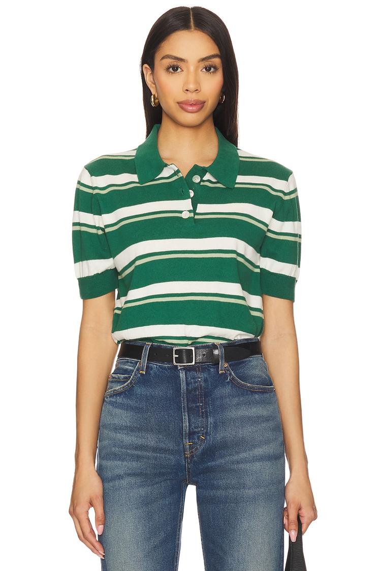 Classic green and white striped polo top crafted from lightweight cotton knit with ribbed trim. Featuring a comfortable regular fit, half sleeves, and a signature polo collar with a front partial button closure, this hip-length top offers timeless casual chic style. Ideal for everyday wear, brunch, or casual work settings, its breathable fabric and versatile design make it a reliable choice for spring, summer, and autumn seasons.