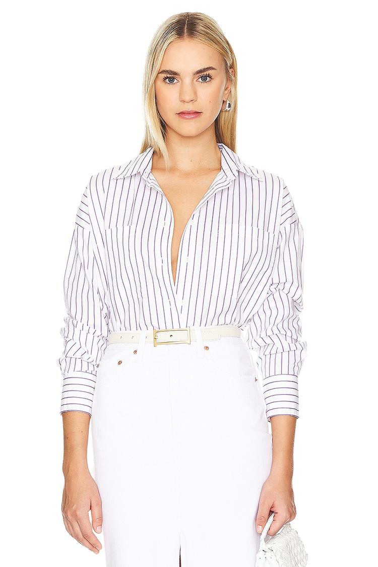 Crisp lightweight cotton poplin with a relaxed fit defines this classic striped button-up shirt. Featuring a traditional collar, long sleeves with button cuffs, and a hip-length hem, it offers a polished yet comfortable silhouette. The all-over blue stripes on a white base create a timeless minimalist look perfect for casual outings, workwear, or business casual settings. Functional front buttons and slip breast pockets add subtle utility to this versatile staple ideal for spring through autumn wardrobes.