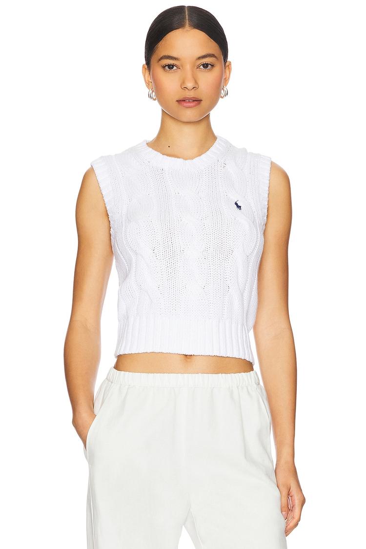 Crisp white cable-knit cotton defines this sleeveless cropped vest top with a classic crew neck and ribbed trim at the hem. The fitted silhouette and midweight knit fabric create a polished yet comfortable look that pairs effortlessly with casual trousers or skirts. Embroidered logo detail adds a subtle signature touch. Ideal for spring and summer brunches, casual everyday wear, or laid-back autumn layering, this preppy staple combines timeless style with breathable cotton comfort.