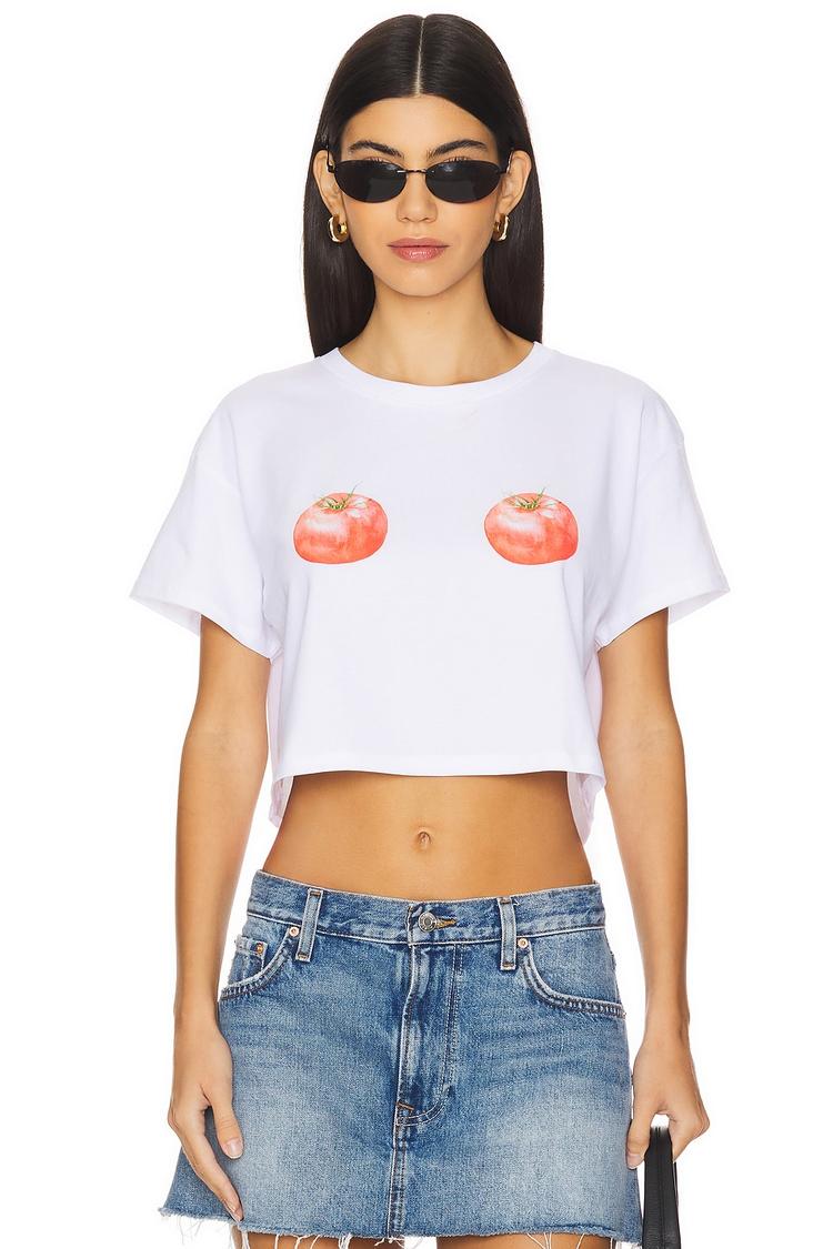 A relaxed cropped cotton tee with a classic crew neck and half sleeves, featuring a playful ripened tomato graphic on the front. This casual chic top boasts a breathable, lightweight fabric perfect for spring and summer days. Its clean white base and vibrant red-orange print make it ideal for everyday wear, brunch dates, or casual outings. The pullover style and covered back ensure comfort and ease, making it a versatile addition to warm-weather wardrobes.