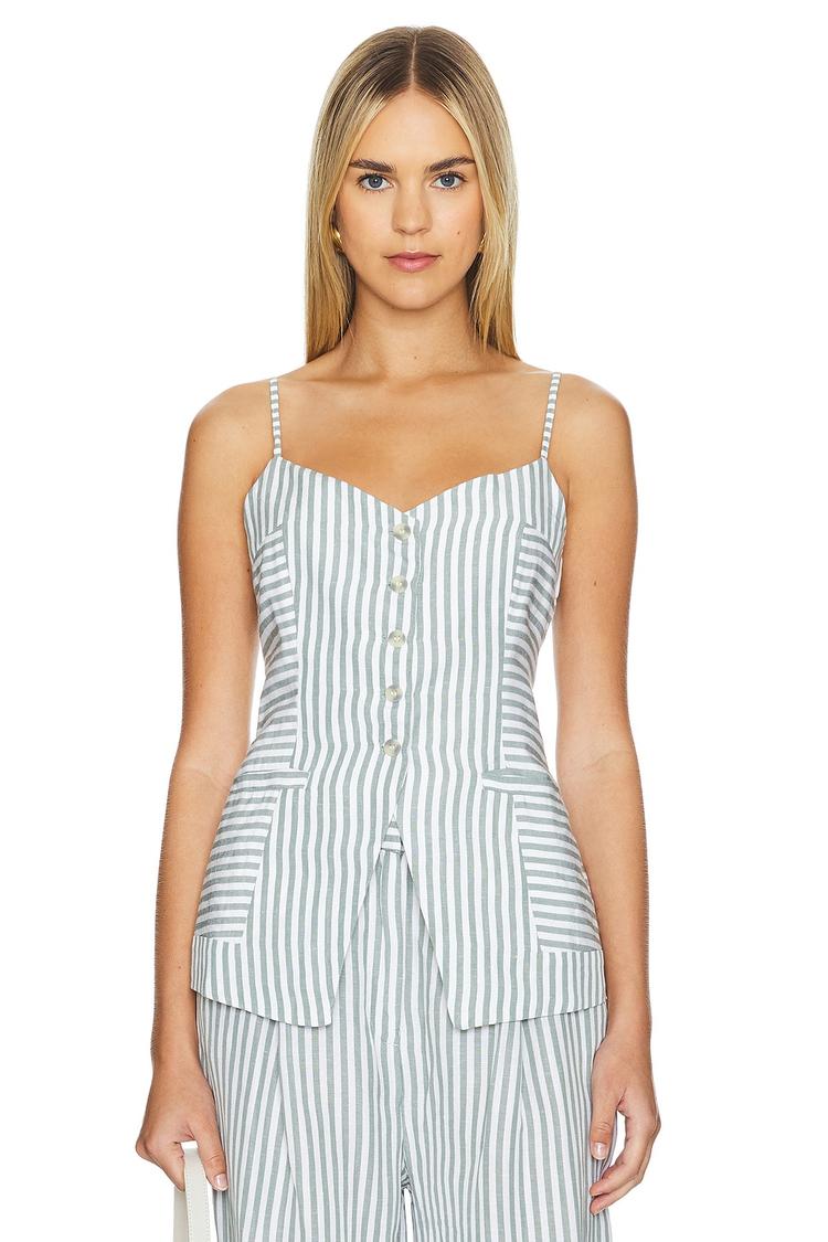 Softly striped in light blue and white, this fitted camisole features a flattering sweetheart neckline and delicate spaghetti straps for a breezy summer vibe. Fully lined with a viscose-linen blend fabric and cotton lining, it offers comfort and breathability. Button closure and front pockets add subtle charm and practicality. Perfect for casual days, brunch dates, or vacation getaways, this hip-length top pairs effortlessly with matching bottoms or denim for a fresh, modern look.