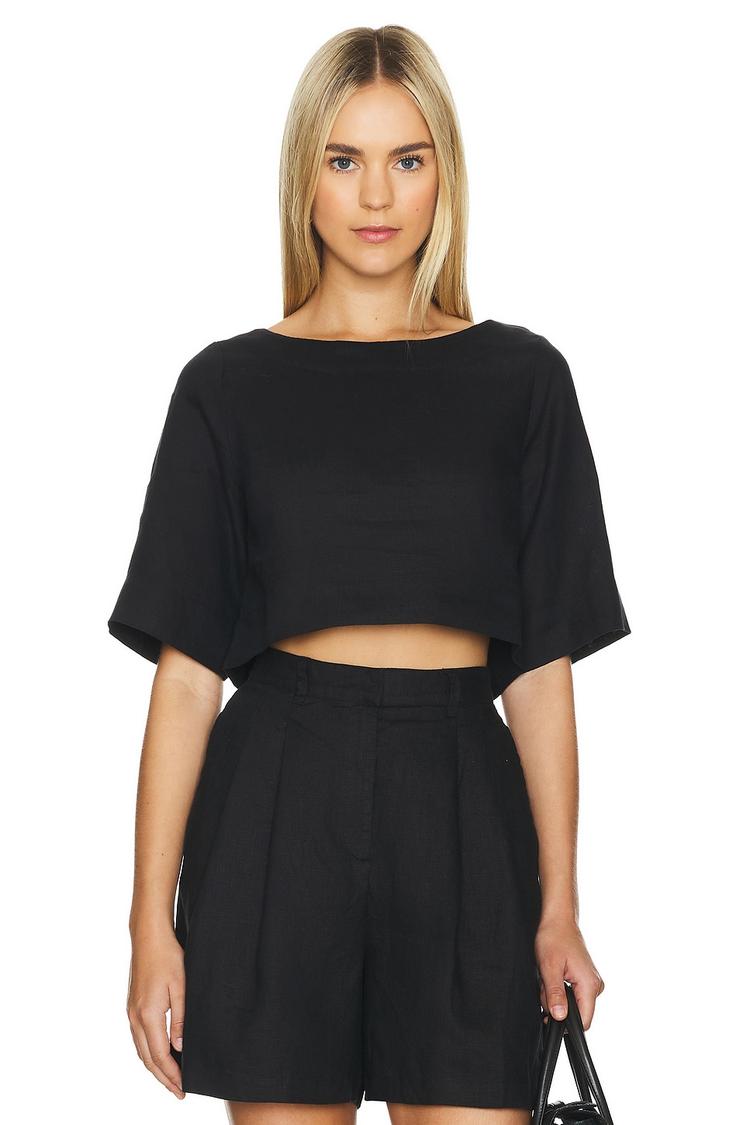 Effortlessly chic in breathable linen, this cropped Shay Top features a relaxed fit with half-length regular sleeves and a classic round neckline. The concealed back zipper ensures a smooth silhouette with a covered back, making it ideal for warm weather. Its minimalist black hue and solid design provide versatile styling options, perfect for casual outings, brunches, or smart workwear looks. Pair it with high-waisted bottoms for a modern, polished ensemble that balances comfort and understated elegance.