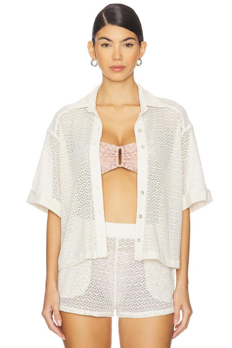 Semi-sheer net fabric with subtle metallic fiber details brings a modern edge to this loose-fitting hip-length shacket. Featuring a classic collar and half sleeves with double-lined cuffs, it offers a breezy, minimalist look perfect for warm spring and summer days. The front button closure enhances its casual chic vibe, making it ideal for casual outings, lounging, beach days, or vacation wear. Crafted from a blend of nylon and lurex, this lightweight top combines comfort and understated shimmer for versatile style.