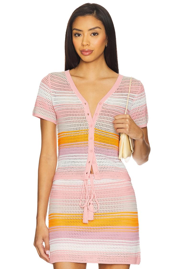 Softly striped in pink, white, yellow, and orange, this slim-fit crochet shell features a flattering V-neck and half sleeves that frame the silhouette with casual chic ease. The thigh-length hem and midweight, semi-sheer viscose-nylon fabric offer breathable comfort and a touch of bohemian flair. Button closure paired with a tie-up detail creates a laid-back yet polished look, making it ideal for spring and summer outings like brunches, casual vacations, or relaxed weekend wear.