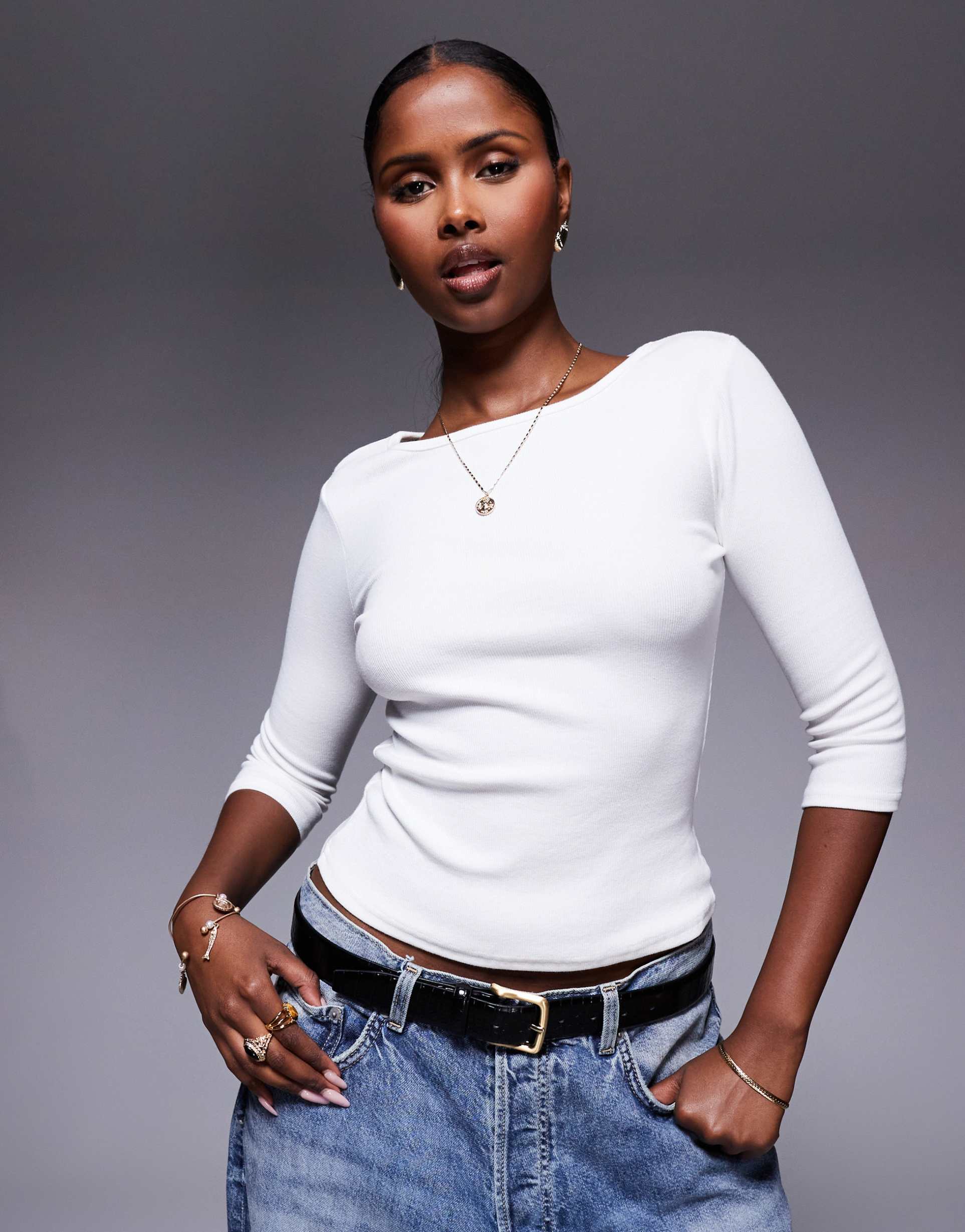 Effortless everyday polish meets laid-back comfort in this white Elaia slash-neck top. The soft, breathable jersey knit—cotton with a touch of spandex—offers a comfortable regular fit that moves with you. A clean slash V-neck flatters the collarbone, while 3/4 sleeves provide just the right amount of coverage. The minimalist silhouette makes it a versatile staple: pair with denim for casual days, or dress it up with a belt and trousers for work or brunch. Simple, flattering, and endlessly recyclable into a chic, everyday capsule wardrobe.