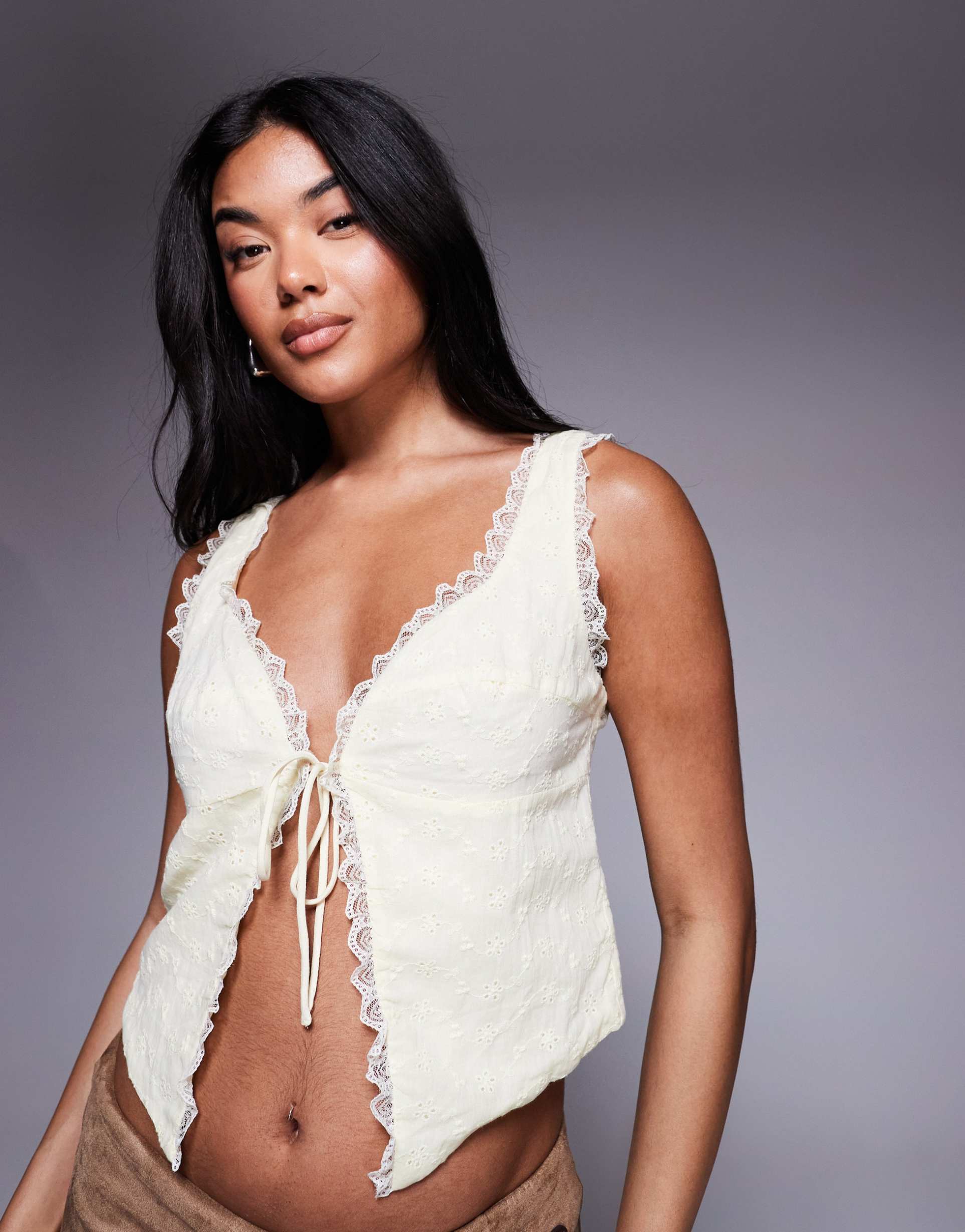 PRINCESS POLLY MERRELLE SCALLOP LACE TRIM DETAIL TIE SPLIT FRONT TOP IN YELLOW