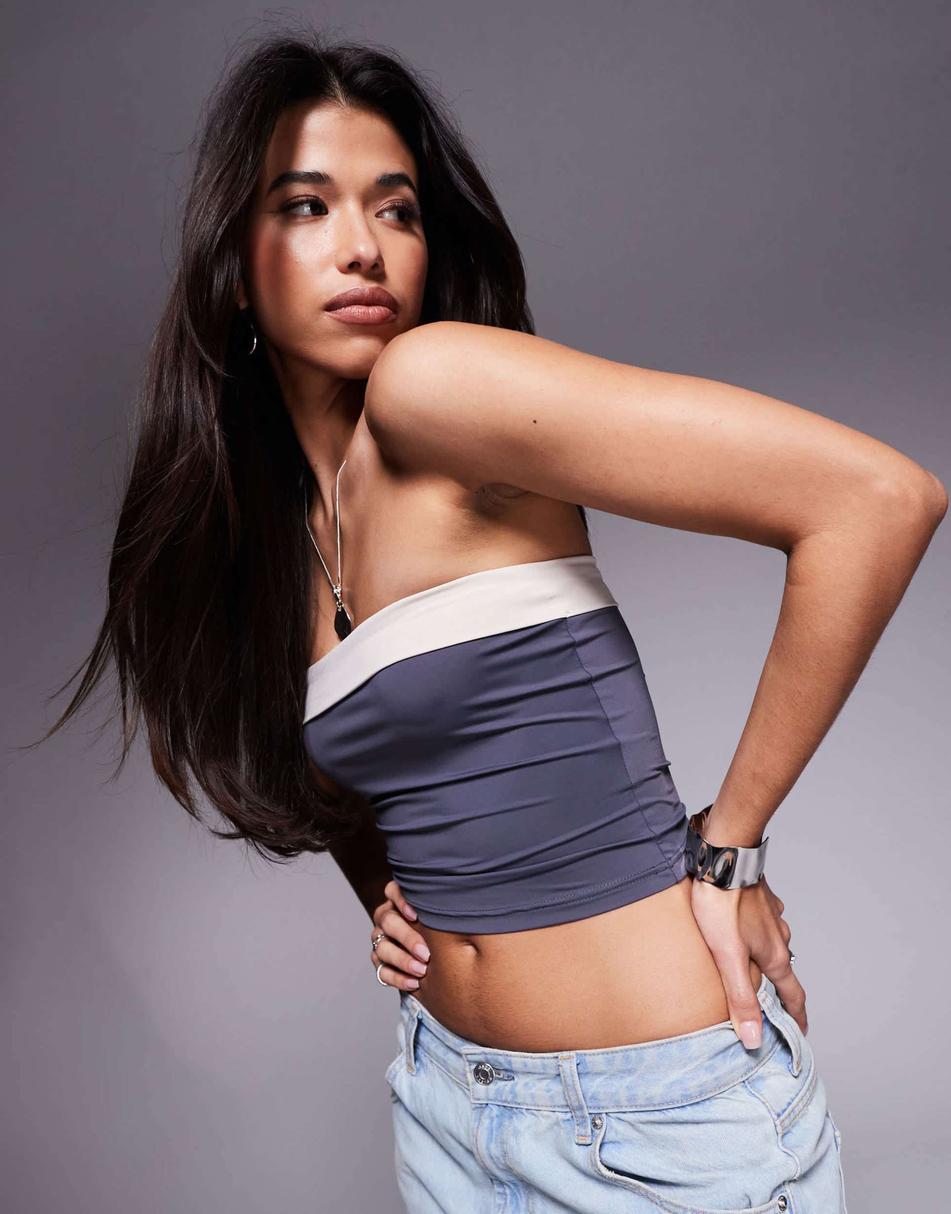 Super-smooth and clingy polyester-elastane fabric shapes this slim fit bandeau top with a chic double-layer design. Featuring a strapless neckline and cropped length, it pairs effortlessly with casual and streetwear looks for spring and summer. The slate gray body contrasted by a crisp white edge adds a minimalist, trendy touch perfect for brunch, casual outings, or laid-back street style. Easy to slip on, this piece embodies casual chic style with a flattering fit and modern simplicity.