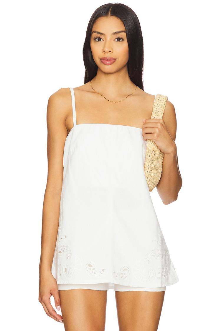 Soft midweight denim in a crisp white hue forms this relaxed fit tank top featuring a straight neckline and sleeveless styling with detachable, adjustable shoulder straps for versatile wear. The hip-length silhouette is enhanced by delicate eyelet embroidery along the hem, adding a subtle decorative touch. Concealed back zipper and hook-and-eye closure ensure a clean finish. Ideal for casual outings, brunch dates, and everyday comfort during spring and summer seasons.