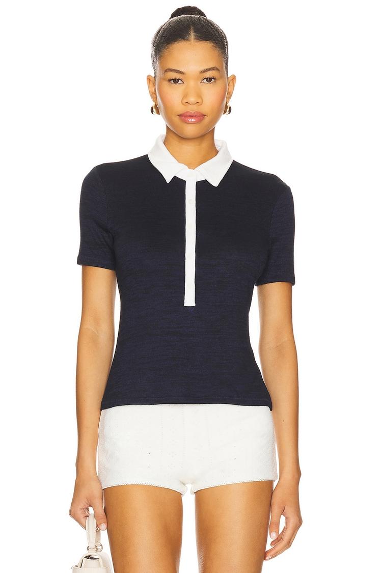 A timeless knit polo top crafted from a lightweight blend of viscose and polyester, featuring a fitted silhouette and half sleeves for a polished look. The dark navy base color contrasts sharply with crisp white accents on the classic polo collar and partial front button placket. Designed for versatility, this hip-length top suits casual, workwear, and business casual occasions, making it ideal for brunch, travel, or everyday wear. Its minimalist and preppy style embodies understated sophistication with breathable knit fabric for comfort across spring and summer seasons.
