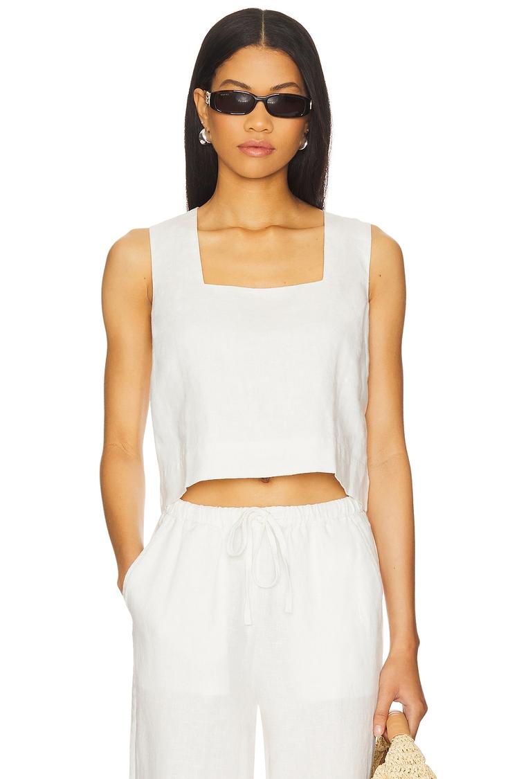 Lightweight linen with a breathable cotton lining shapes this cropped tank top with a minimalist square neckline and wide straps. Its regular fit and pullover style offer effortless comfort, while the semi-sheer fabric adds a subtle airy touch. Perfect for warm-weather days, this versatile piece fits casual outings, brunches, and vacation wardrobes with ease.