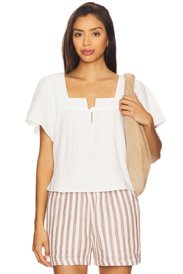 Soft white organic cotton gauze and a relaxed blouson fit create an airy feel in this hip-length top. Its square neckline and delicate front tie bow add a subtle feminine touch, while flutter sleeves provide effortless movement and charm. Ideal for warm spring and summer days, this minimalist casual chic piece pairs perfectly with striped shorts for brunch, everyday errands, or vacation adventures. Machine washable and lightweight, it’s a breathable essential that blends comfort with understated style.