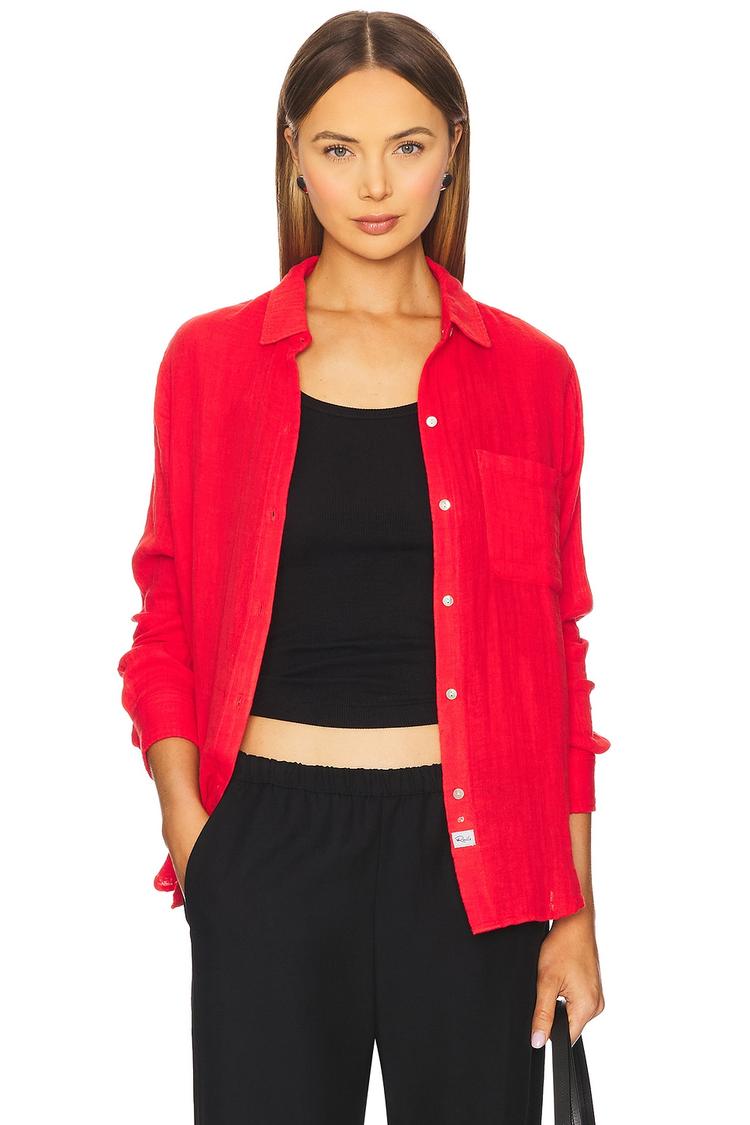 bright red button-up shirt