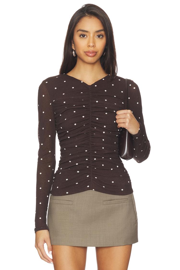 The Georgina Top features a sleek matte black base adorned with classic white polka dots, creating a timeless look. Crafted from smooth polyester, this waist-length shell top offers a slim fit enhanced by elegant ruching along the front and back seams. Its flattering V-neckline and long regular sleeves make it versatile for all-weather wear. Perfect for casual outings, brunch dates, or business casual settings, this chic and minimalist top combines style with comfort for everyday sophistication.