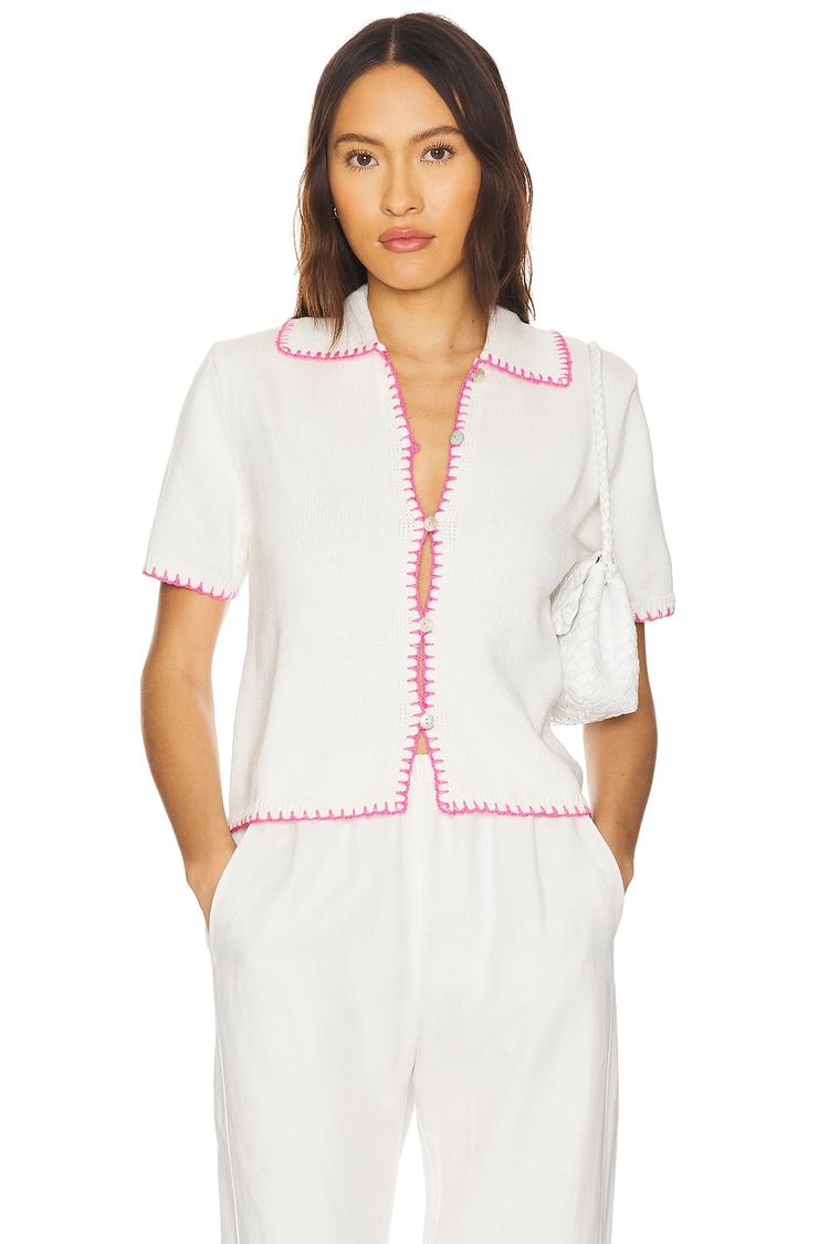 Soft cotton knit and a regular fit shape the Maliah Sweater Top, featuring a crisp V-neck and half sleeves. This hip-length shell showcases charming pink contrast stitched trim along the collar, cuffs, front, and hem, accented by delicate mother-of-pearl buttons for closure. Its classic and minimalist style is perfect for casual outings, workwear, business casual settings, and brunch dates across spring, autumn, and all-weather seasons.
