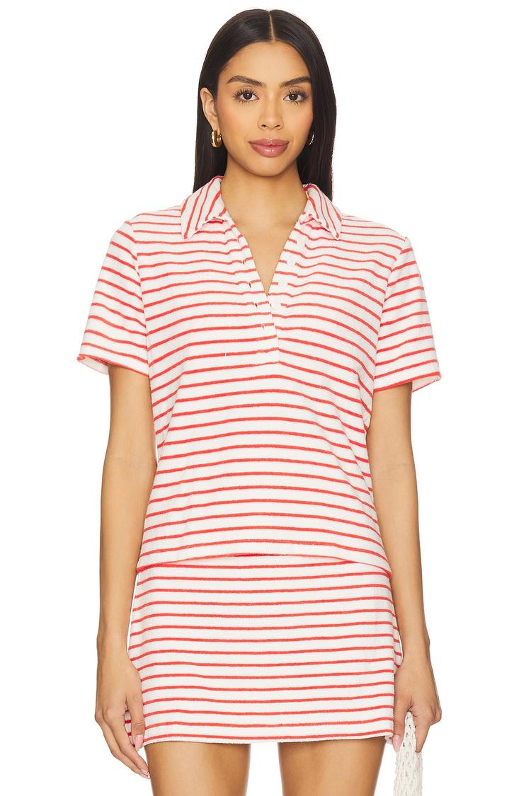 Soft terrycloth cotton and a relaxed fit define this Naveli Polo top, styled with a classic red and white striped pattern. Featuring a timeless polo collar and half sleeves, it falls to a thigh length for comfortable coverage. The front partial button closure adds subtle detail to the laid-back silhouette. Ideal for casual days, brunch outings, or vacation wear, this breathable cotton piece offers easy versatility and enduring style across spring and summer seasons.