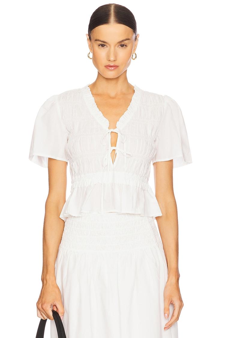 Delicate smocked bodice and ruffled trim define this white peplum top crafted from a midweight cotton and lyocell blend poplin fabric. The fitted silhouette with a waist-length hem and half sleeves creates a flattering shape, while the V-neck with front self-tie closures adds a charming detail. Perfect for spring and summer occasions, this semi-sheer top transitions seamlessly from casual brunches to polished workwear settings, offering timeless romantic style with breathable comfort.