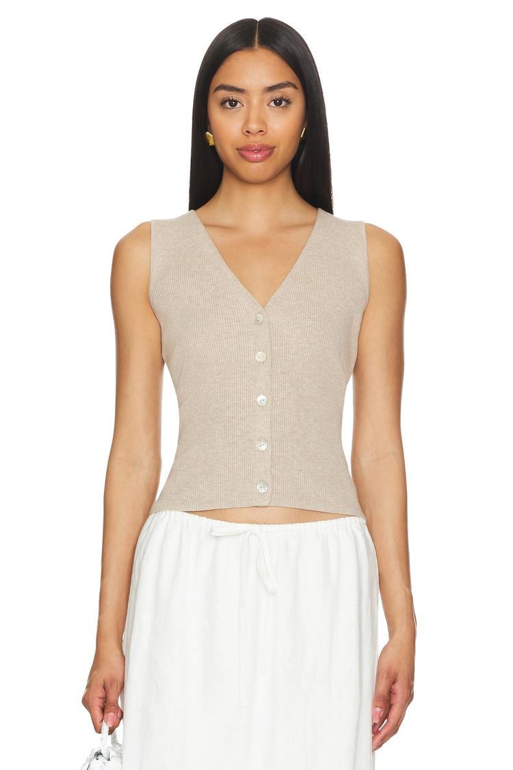 Soft beige knit fabric and a fitted silhouette define this cropped top with a flattering V-neckline and sleeveless strapless styling. Featuring a front button closure, this lightweight knit piece is perfect for warm weather and versatile enough for casual outings, brunch dates, or everyday wear. The minimalist design pairs effortlessly with various bottoms, making it a chic addition to any spring or summer wardrobe.