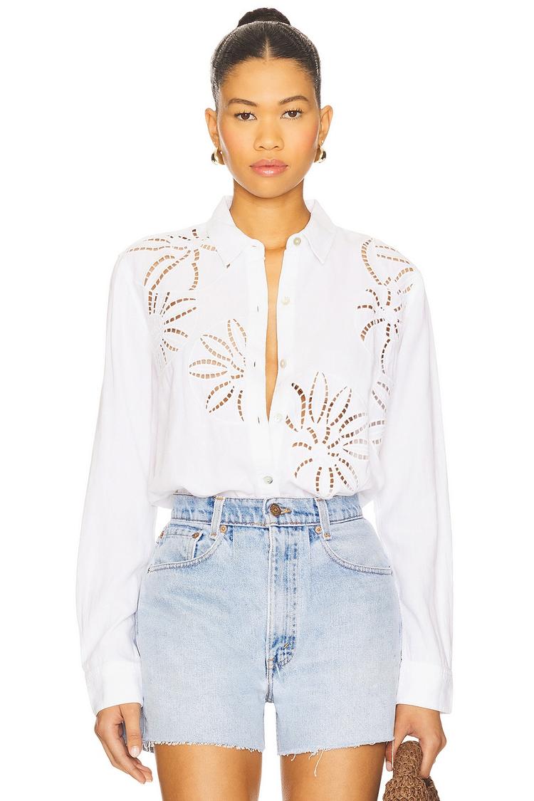 Crisp white linen with delicate eyelet embroidery creates an elegant and classic vibe in this hip-length blouse. Featuring a mandarin collar and long regular sleeves, this top offers a regular fit with front button closure for easy wear. Sheer accents add a subtle, sophisticated texture perfect for warmer seasons. Ideal for casual brunches, business casual workwear, and travel, it blends minimalist style with breathable fabric for versatile everyday sophistication.