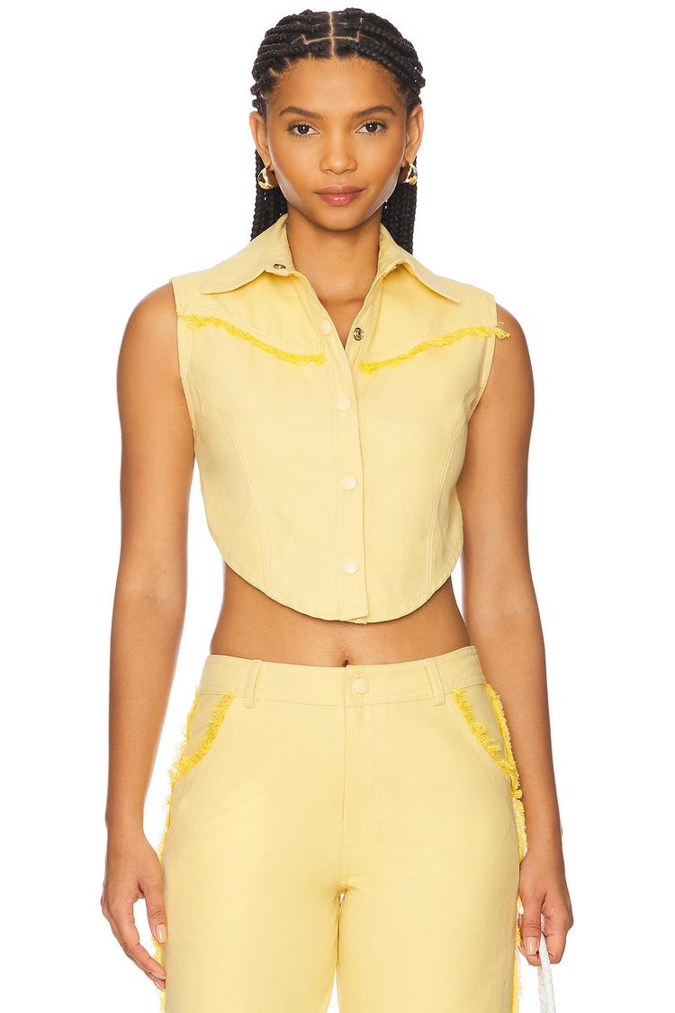 Crisp midweight cotton canvas with tonal fringe trim defines this cropped sleeveless top featuring a classic collar and front snap button closures. The open back with an adjustable snap button strap adds a bold western-inspired detail, making it a standout piece for casual streetwear, brunches, and spring or summer outings. Its regular fit and cropped length offer a flattering silhouette that pairs effortlessly with high-waisted bottoms. Versatile and stylish, this Antonella Top blends relaxed comfort with edgy design elements.