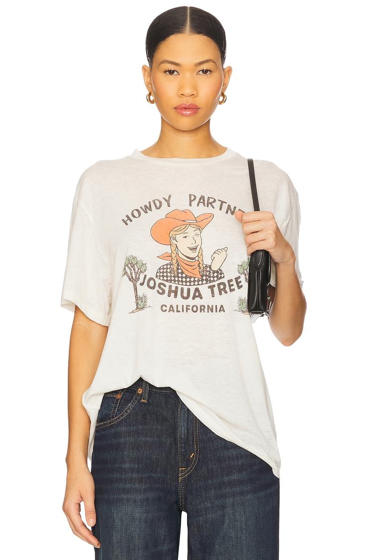 Soft blend of recycled polyester and organic cotton defines this loose-fit boyfriend tee, featuring a classic white base with a charming Joshua Tree graphic in warm brown and orange hues. The relaxed silhouette with half sleeves and a crew neckline offers everyday comfort and street style appeal. Perfect for casual outings, errands, and weekend hangouts, its hip-length cut pairs effortlessly with jeans or shorts. Embrace sustainable fashion with this versatile pullover that balances comfort and laid-back cool for all seasons.