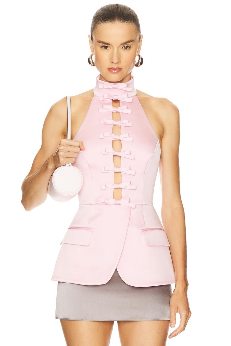 Soft matte light pink satin brings a modern elegance to this fitted hip-length corset top. Featuring a halter neck with button loop closures and a striking front cut-out adorned with delicate bows, it creates a chic silhouette enhanced by boned sides for structure. The sleeveless design and hidden back zipper provide a sleek finish, while faux flap pockets add subtle detail. Ideal for casual brunches, night outs, or sophisticated gatherings, this polyester top blends contemporary style with refined details for versatile wear.