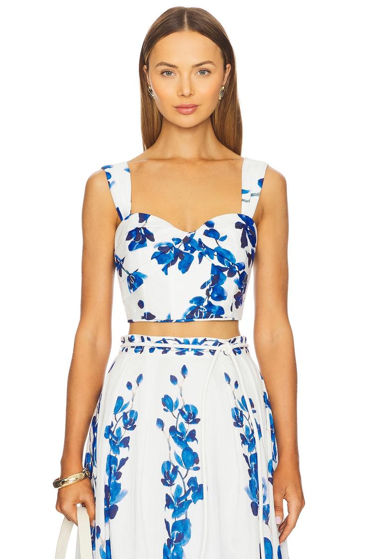 Effortless coastal chic meets refined artistry in this Orchid Blues cropped top. A pristine white canvas is kissed with bold blue botanical florals, faintly pleated at the bodice and anchored by a boned, structured silhouette. The wide, strap-top neckline and sleeveless design create a poised, modern silhouette, while a discreet back zipper keeps the line clean and sleek. Crafted from a breathable Lyocell–linen–nylon blend with cotton and polyester linings, it pairs beautifully with the matching skirt for a vacation-ready, event-appropriate look. Dress it up with gold accents for evenings out or easy day-brunch styling.