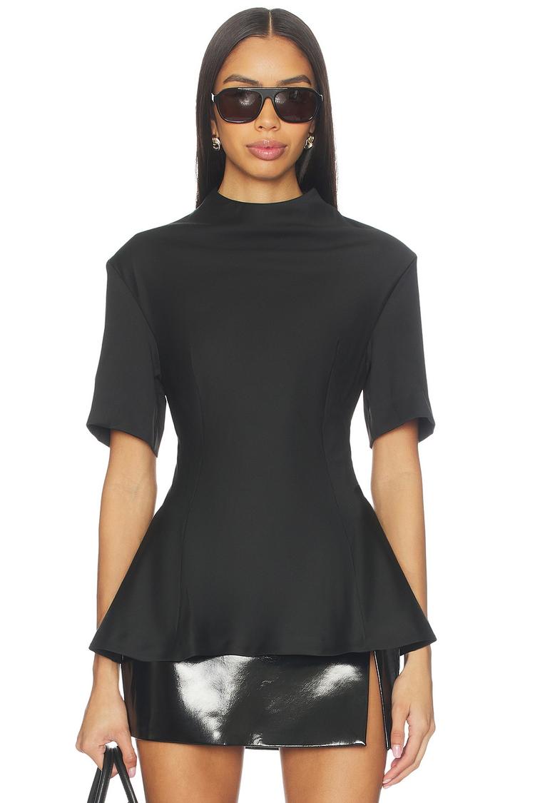 Structured with a timeless peplum silhouette, this black top features a sleek mock neck and elbow-length sleeves, crafted from a midweight crepe fabric blend of polyester and viscose. Its fitted cut enhances the waistline, while the subtle ruffle hem adds a refined touch of femininity. The hidden back zipper ensures a seamless finish. Ideal for workwear, business casual settings, and stylish brunches, this versatile piece pairs effortlessly with skirts or tailored pants for a confident, polished look.