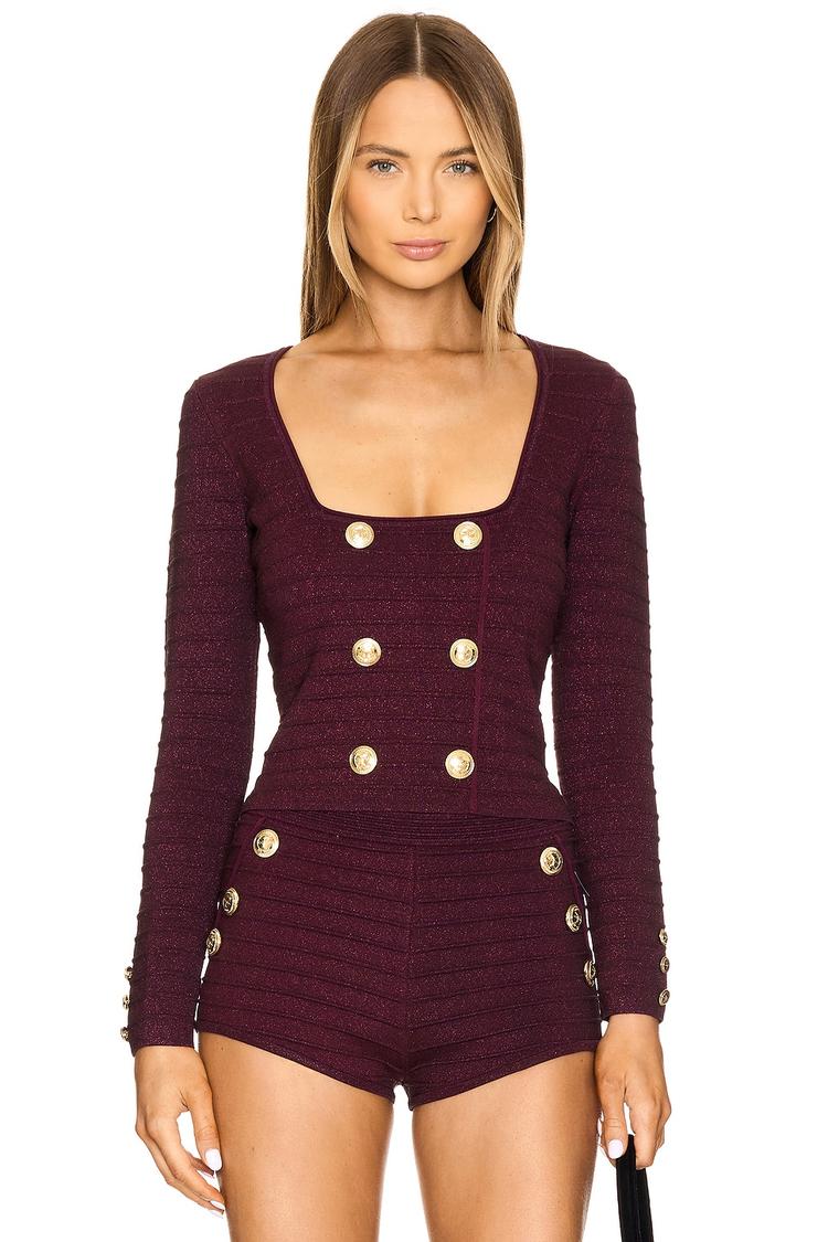 A sophisticated corset top in a fitted silhouette crafted from a midweight knit fabric interwoven with metallic threading for subtle shimmer. The square neckline and long regular sleeves provide elegant coverage, while the cropped length enhances its modern appeal. Faux gold button details adorn the front, adding a chic touch. This matte burgundy piece is perfect for autumn and winter evenings, ideal for casual outings, date nights, or stylish night outs where polished yet trendy attire is desired.