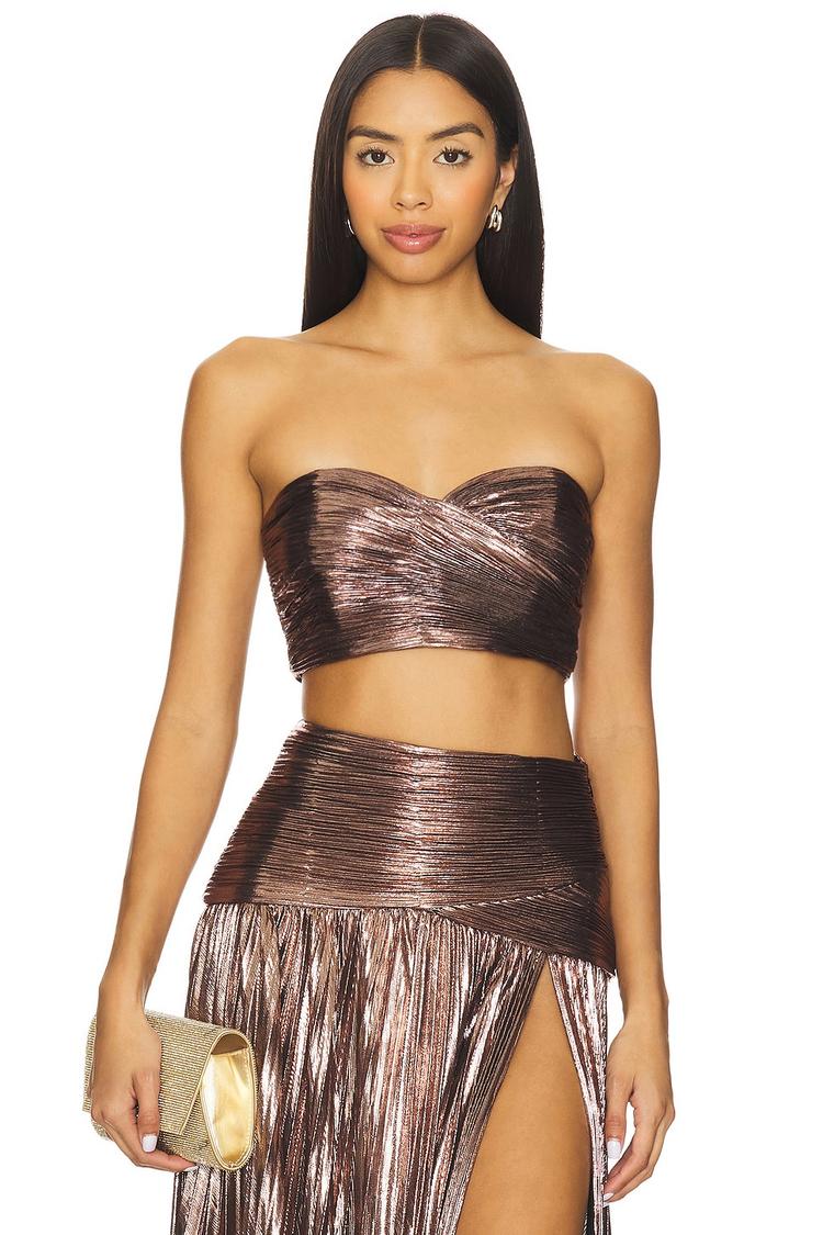 Metallic bronze shine and a fitted silhouette define this chic bandeau cropped top. Featuring a sweetheart neckline and strapless styling, it offers a modern, sexy vibe perfect for spring and summer nights. The side zipper closure ensures a sleek fit while the textured, ruched fabric adds depth and dimension. Ideal for cocktail parties, date nights, or clubbing, this piece elevates your evening wardrobe with effortless glamour and contemporary edge.